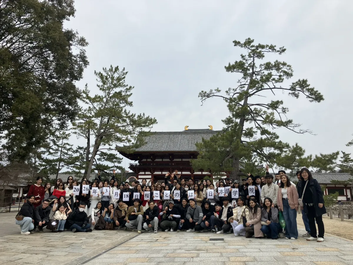 3月18日、本校の全学生でバスに乗って奈良へ校外学習に出かけました。天気予報では昼から雨とのことでしたが、朝の出発時にはまだ曇り空。学生たちは「鹿に会えるかな」「大仏を見てみたい」と期待に胸をふくらませ、にぎやかにバスへ乗り込みました。